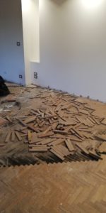 Siamo in un cantiere a Udine per la ristrutturazione di un appartamento degli anni ’60. Si esegue la rimozione del pavimento in legno: listelli in rovere appoggiati su guaina bituminosa e strato di sabbia.